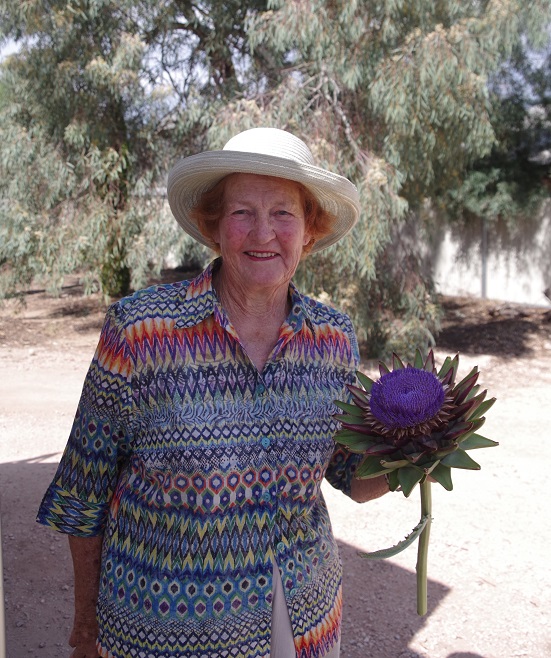Dorothy displaying the magnificent globe artichoke flower that she grew in her Underbool garden.